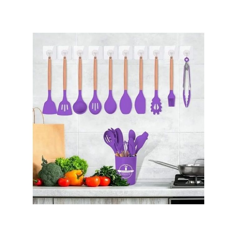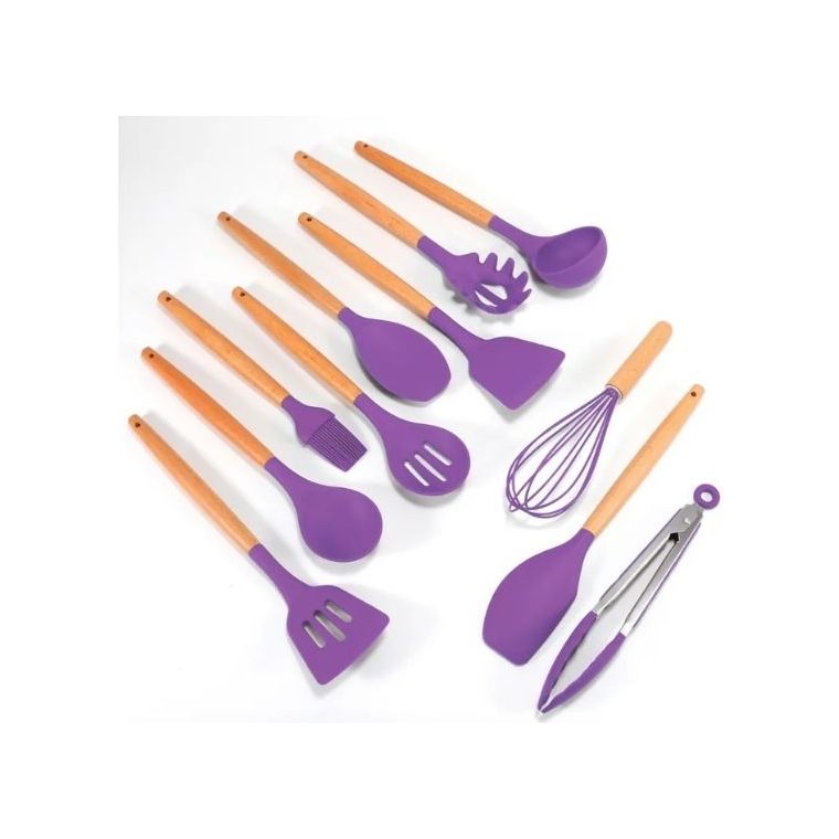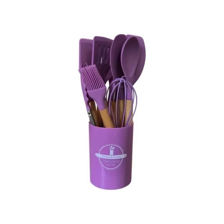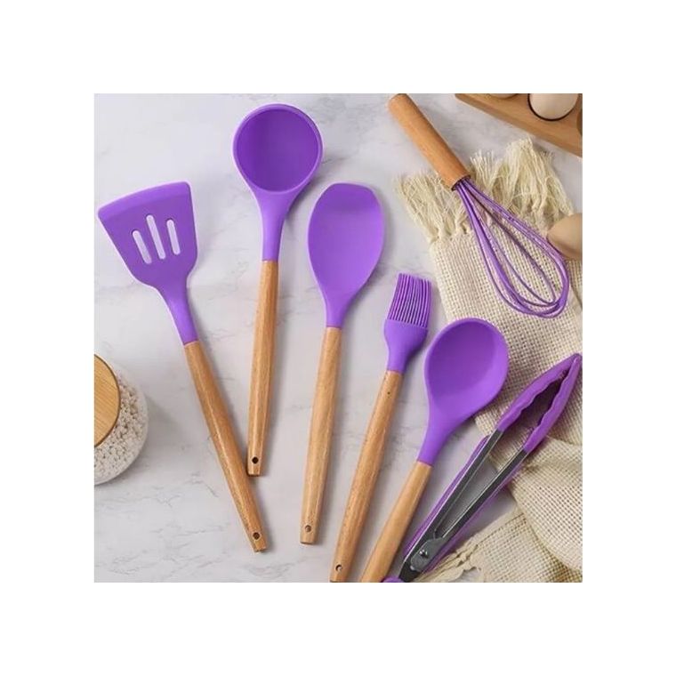 Kit 12 Pçs Utensílios Cozinha Silicone Antiaderente Madeira Cor Lilás