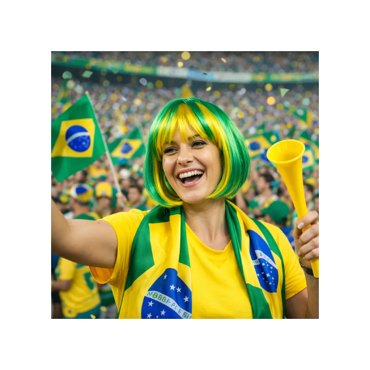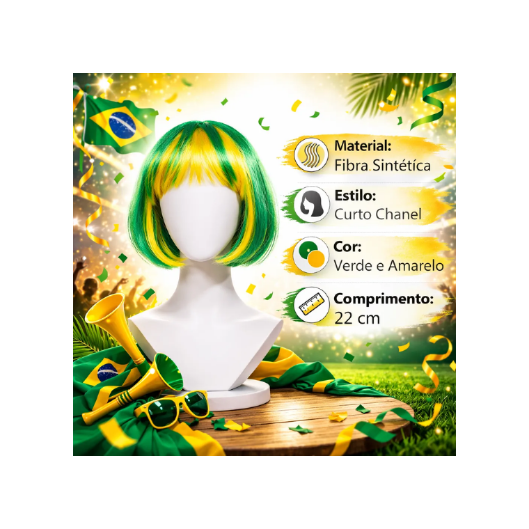 Entre no clima da torcida com muito estilo. A peruca verde e amarelo modelo chanel é o acessório ideal para quem quer se destacar em jogos da seleção, festas temáticas, Carnaval e eventos esportivos.